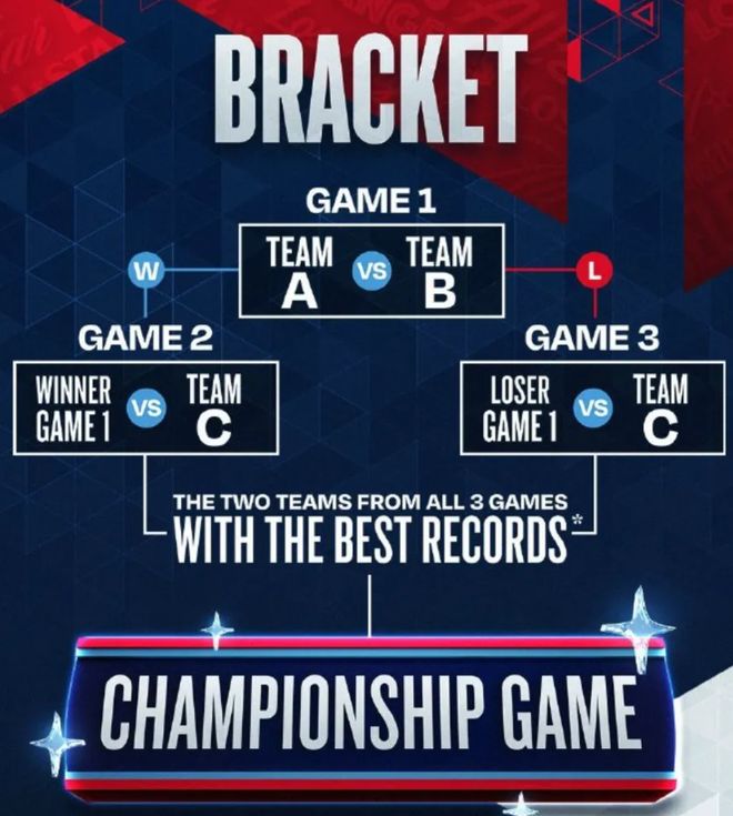 这3支球队要进行3场循环赛,战绩最好的两支球队进入最后1场冠军赛,每场比赛都是12分钟。如果3支球队都打成了1胜1负,那么就看净胜分,选出两队进入冠军赛。